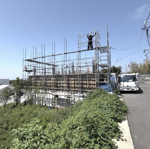 相模湾と富士山を望む敷地にて、現場がスタートしています。 地中に鋼管を打ち込んで地盤を...