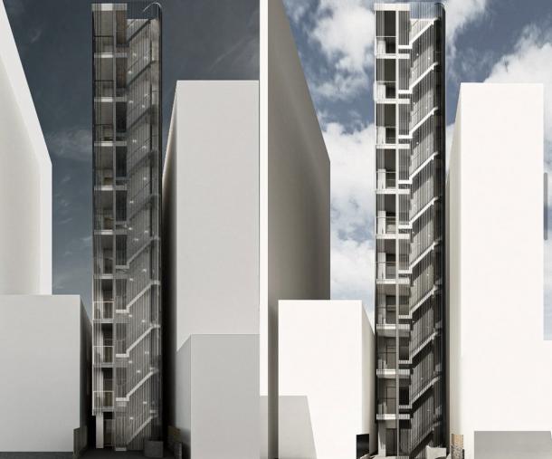 押上で進めている、高さ方向に伸びたフロア一室のホテル。 高さを更に強調するように縦ルー...
